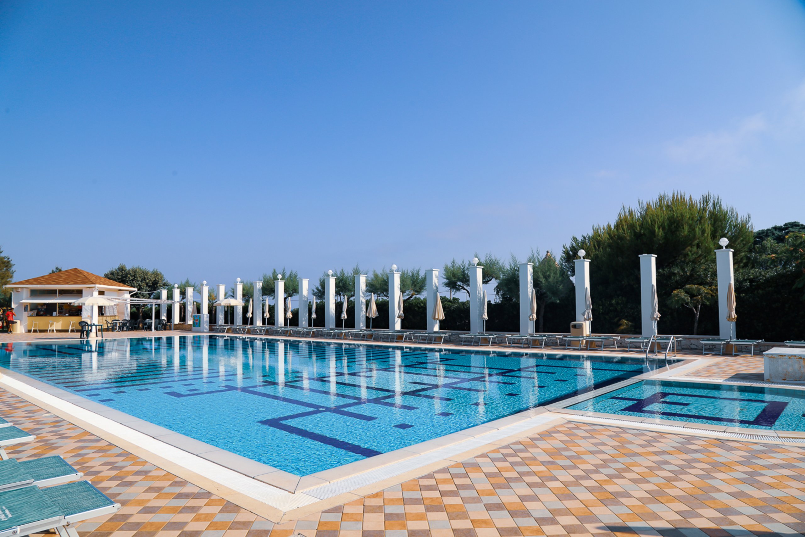 Ausstattung: Restaurants, Lounge Bar, Kongressraum, Garten, Swimmingpools mit fantastischer Aussicht, Liegen und Sonnenschirmen, Wellnessbereich mit Biosauna, Erlebnisduschen, Jacuzzi, und Fitnessraum, eigener Strand, Tennisplatz, Volley- Beach Volley und Basketballplatz